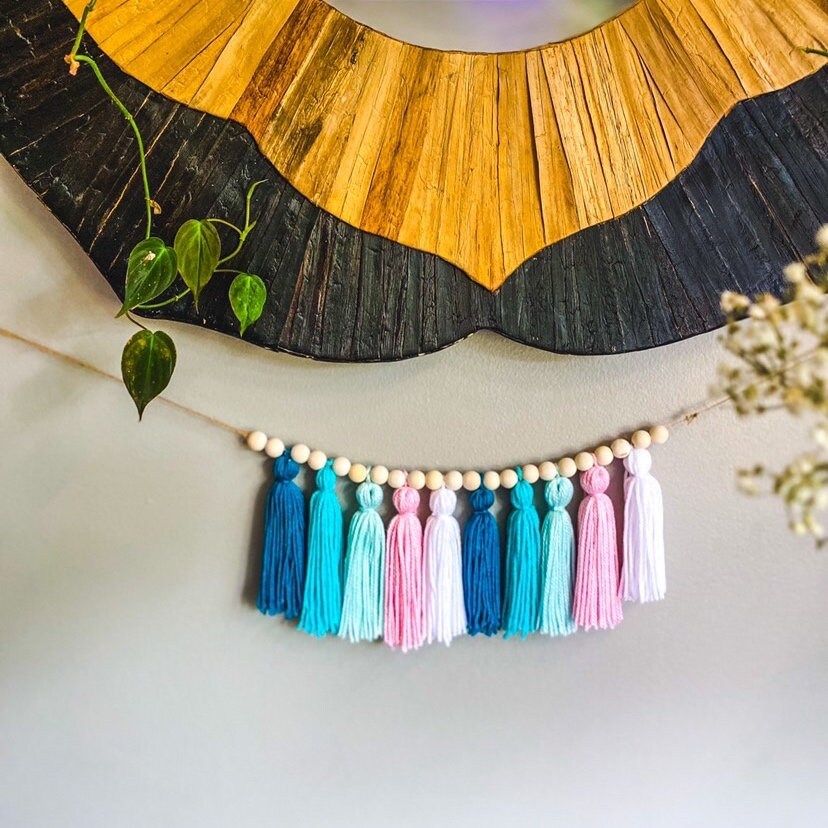 This amazing and vibrant tassel garland is iconic and so unique for any room in the home. This garland we used amazing organic fibers that will add a pop of color to you sweet home. We used lots of fun Blue colors that blend smoothly and bring a smile to your face when you see it. Very neutral colors as well that will work great for a nursery room, for a party decor, or for any room!